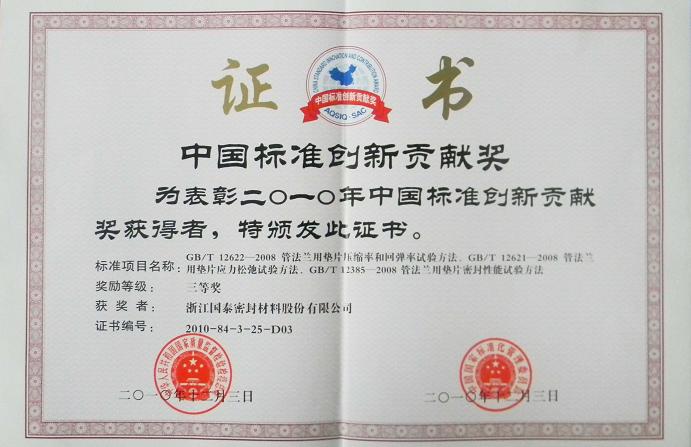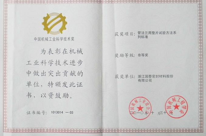 2010年10月30日,国泰密封“管法兰用垫片试验方法系列标准”获得中国机械工业科学技术三等奖;同年12月3日,GB/T 12622-2008 管法兰用垫片压缩率和回弹率试验方法、GB/T 12621-2008 管法兰用垫片应力松弛试验方法、GB/T 12622-2008 管法兰用垫片密封性能试验方法,获中国标准创新贡献奖三等奖。