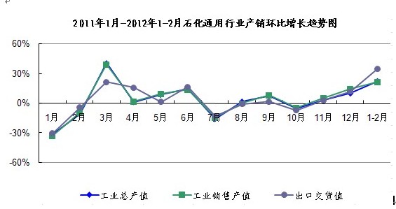 2012年2月,全国石化通用行业完成工业总产值1,128.23亿元,同比增长37.12%,环比增长22.61%;完成销售产值1,078.99亿元,同比增长35.8%,环比增长21.56%。