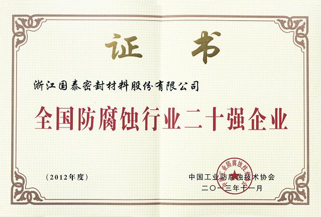 2013年11月6—8日,第五届中国国际腐蚀控制大会于北京召开。大会公布表彰了《2012-2013年中国防腐蚀行业百强榜》入围企业与个人。国泰密封获评“2012-2013全国防腐蚀行业二十强企业”和“全国防腐蚀压力管道二十强企业”殊荣。